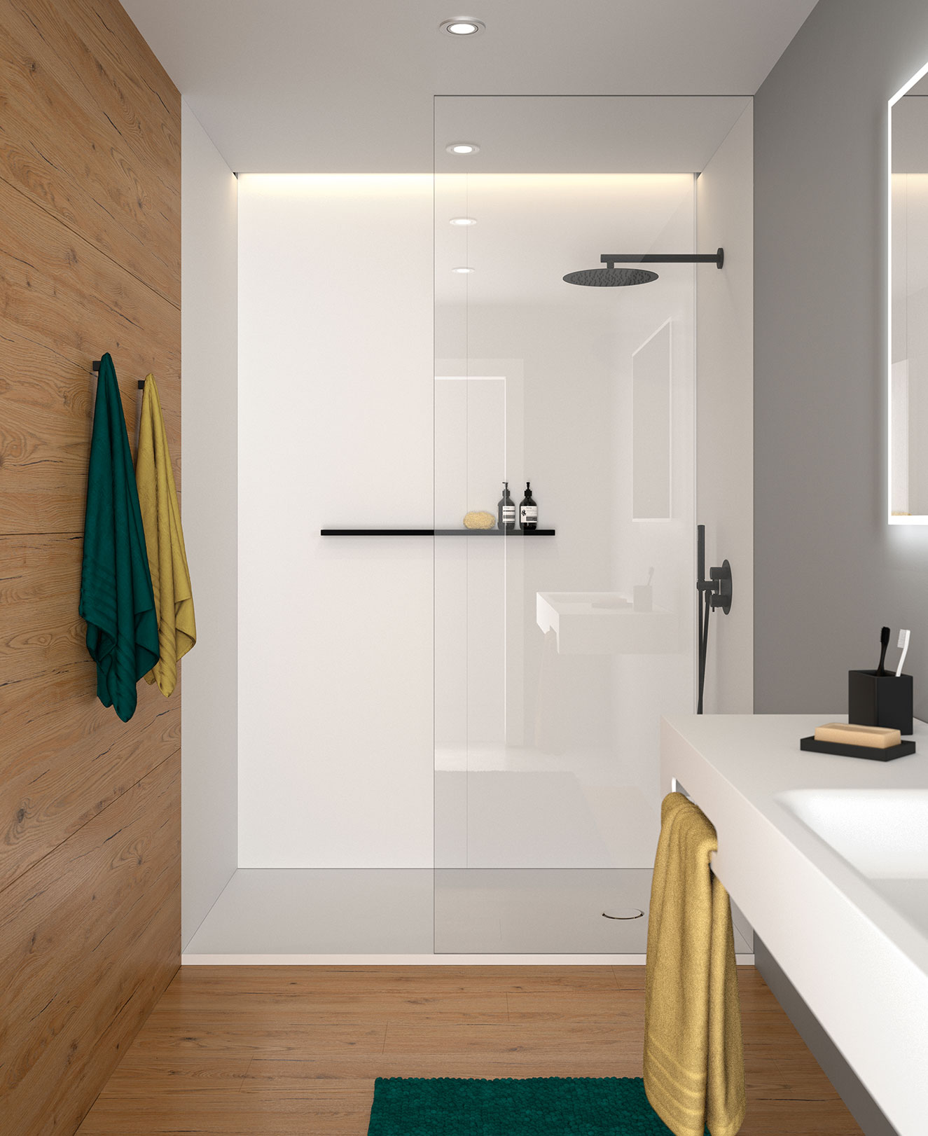 Dusche mit Wandpaneelen aus Naturmaterialien